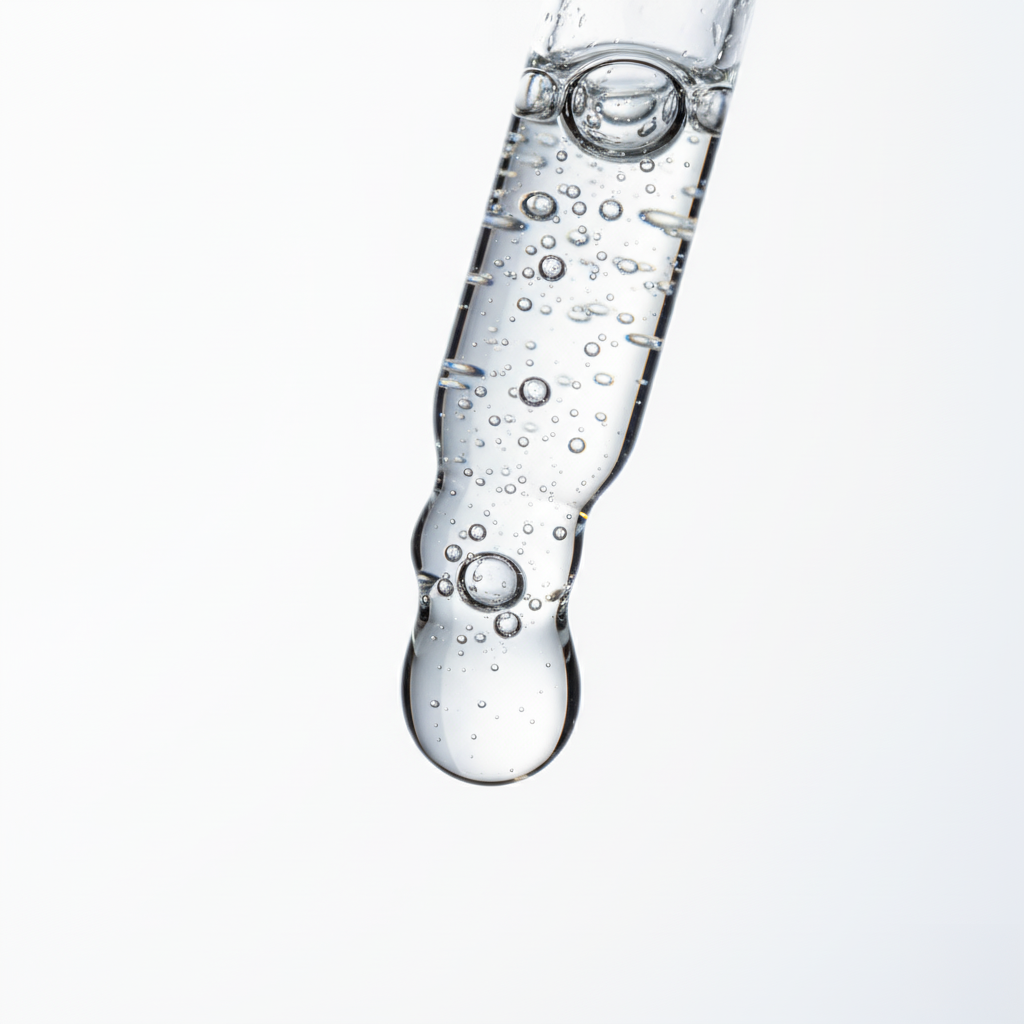 Pipette releasing drop of purple gel, highlighting skincare and laboratory use.