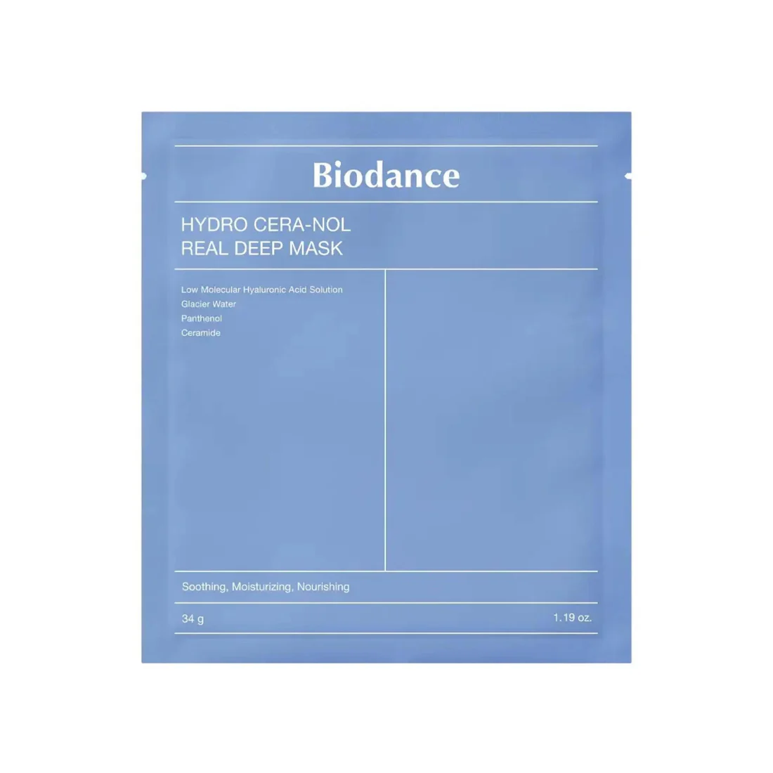 Biodance Hydro Cera-Nol Real Deep Mask provides intense hydration, deep barrier repair, and plumping benefits, transforming into a transparent film as it delivers moisture, soothing, and elasticity to the skin.