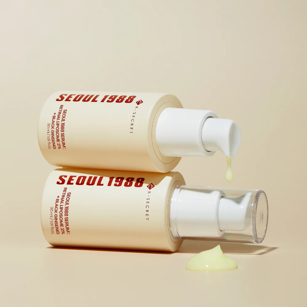 The K-SECRET SEOUL 1988 SERUM is a potent anti-aging serum that combines 2% Liposomal Retinal and Black Ginseng to visibly reduce the appearance of wrinkles, improve skin elasticity, and enhance overall skin vitality for a firmer, smoother, and more youthful complexion.
